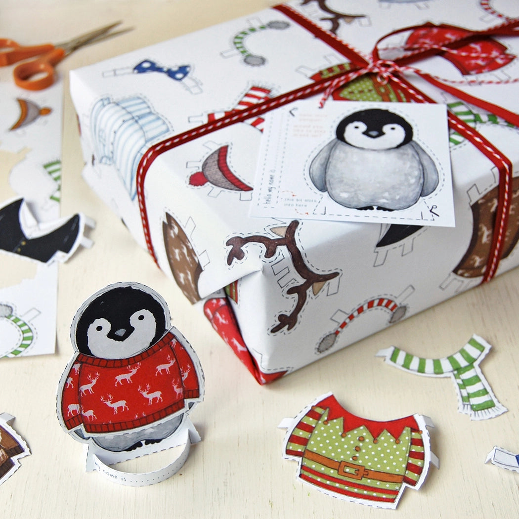 The included gift tags can each be cut out to make an adorable baby penguin paper doll. The wrapping paper is full of outfits to cut out and dress your little 'pingling' in.